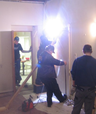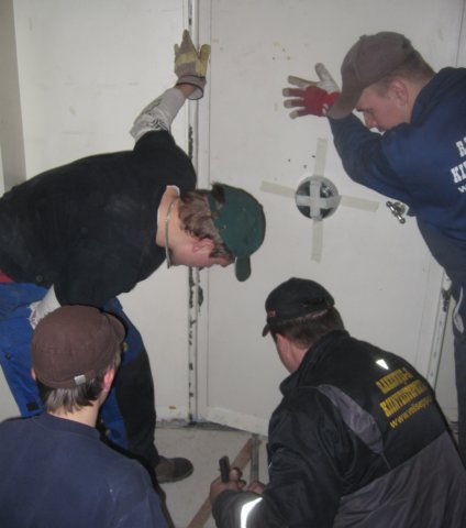 Seppä kankeamassa ovea oikeaan asentoon. Muut miehet