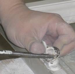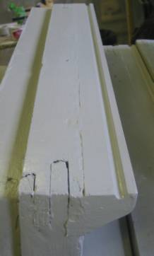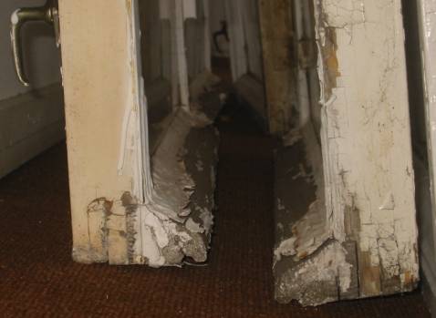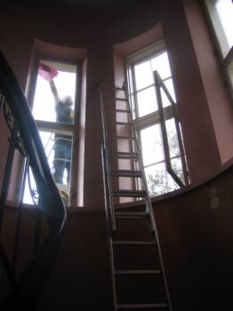 Tämän jälkeen verstaalla sisäpokien lateksimaalikerrokset poistettiin kuumailmapuhaltimella ja kaapimalla. Tasaiset maalipinnat hiottiin tasohiomakoneella. Pokien pyöreät muodot, etenkin sisänurkkaukset ja lasien vierustat ovat kärsivällisyyttä ja taitoa vaativaa käsityötä.