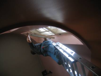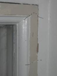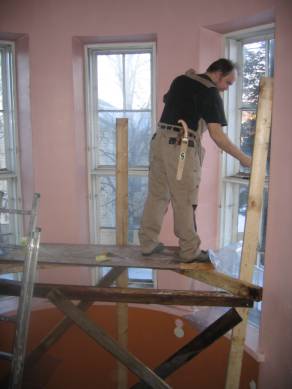 7.3.2006. Ensimmäiset sisäpokat irrotettiin. Sisäpokissa ja karmien huoneen puoleisissa osissa ei ollut lahoa. Pokat merkittiin kynällä, jotta ne verstasreissun jälkeen helposti löytävät takaisin omille paikoilleen. Poistetun sisäpokan tilalle pingotettiin kasvihuonemuovi, joka kiinnitettiin karmiin nitojan niiteillä. Tällä tavoin ulkopokan ja muovin väliin jäävä ilmamassa toimi lämmöneristeenä ja muovi päästää luonnonvaloa huoneisiin.