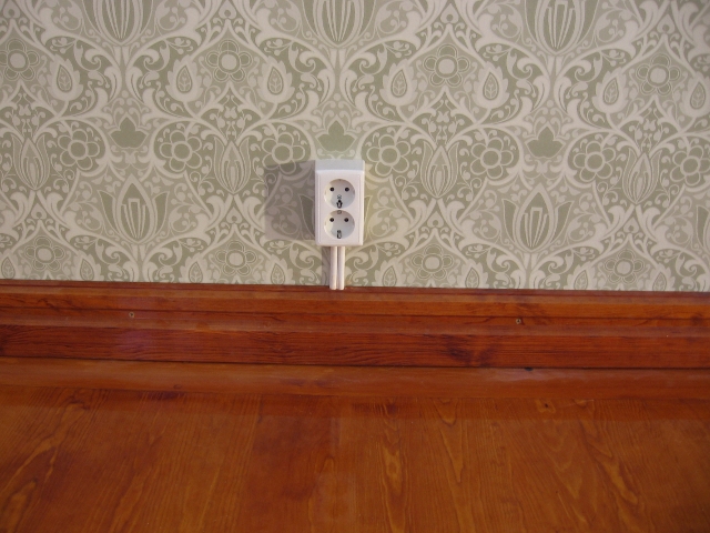 alkuperäinen lattia.![]() Kuvassa poistetaan alkuperäisen lattian päälle liimattua harmaata pahvia. Ei-alkuperäinen muovimatto ja lastulevy on jo poistettu. Lisätietoa tästä