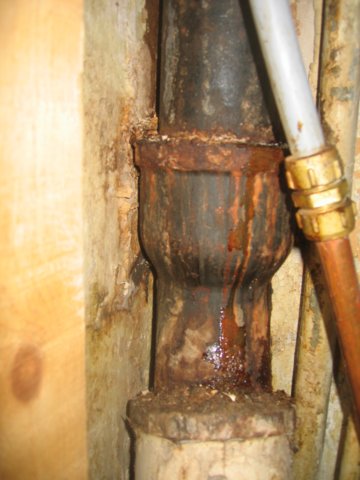 Oy:n ja raahelaisten LVI-urakoitsijoiden kanssa. Tässä on kuva katutason entisen henkilökunnan wc:n (eli nykyisen taukotilan) kaakkoisurkassa laskeutuvasta viemäristä silloin kun toisen kerroksen kaksion nykyisen keittiönurkkauksen vesipisteestä lasketaan reippaammin vettä tiskialtaaseen. Yli 90 vuotta sitten tinattu tinaliitos on syöpunyt (tai kolahtanut) rikki ja valurautainen viemäri vuotaa. Vesi valuu kellarissa alapuolella (ja hieman etelämpänä) sijaitsevan portaikonalusvaraston pohjoisseinän vasempaa laitaa pitkin hissukseen haihtuen, ei niin vuolaasti että varaston lattialle syntyisi lammikko. Tällainen vaurio vaatii pikaisen tilannearvion ja korjauksen. Lisää kuvia viemäriremontin vaiheista löytyy täältä. |