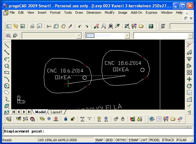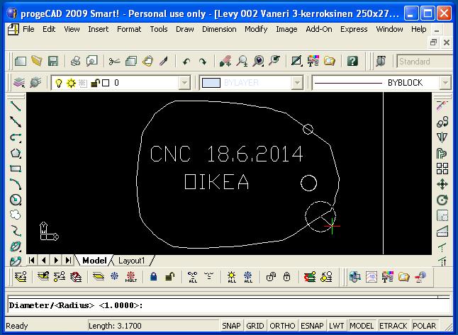 dwg-tiedosto ProgeCAD-ohjelmalla. Kirjoita lappuun ja sen viereen