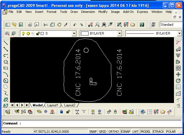 - Seuraavaksi merrotaan PrimCAMille mallipiirustuksen ulkoreunan